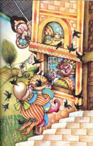 El rey cuenta el dinero, la reina unta con miel redondos panecillos que saben a pastel. En el jardín la chica extiende la colada y
