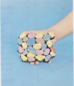 Pega en el centro del corcho o del cartón una de las piedrecitas más grandes. Engoma otras piedrecitas en círculo alrededor de la pieza del centro.