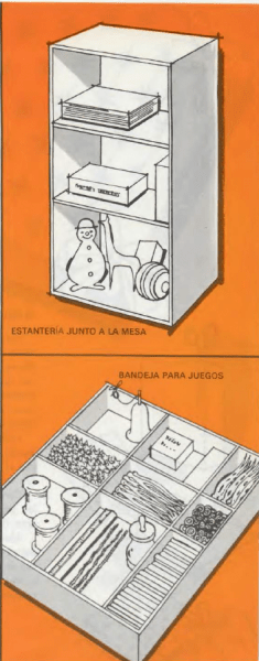 Apila tres cajas de cartón del mismo tamaño una encima de otra. Unelas con cinta adhesiva. Decora la parte superior y los lados. El estante de abajo es el más adecuado para los juguetes. En el estante de en medio puedes guardar cosas planas, tales como papel, libros para colorear y cartón. En el estante superior coloca una bandeja, y en ella los objetos que utilices para jugar (lee el siguiente apartado).