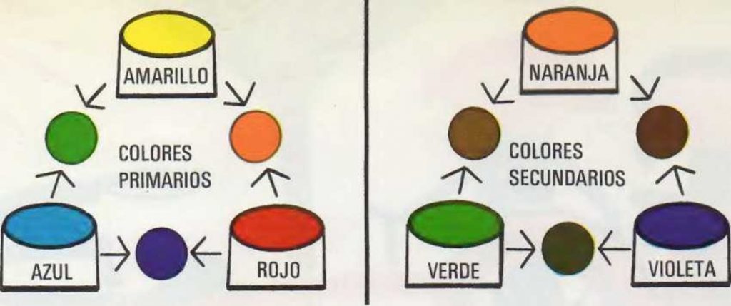 Si mezclas los colores que obtengas de los tres primarios, obtendrás otros distintos. El diagrama muestra también los colores derivados de ellos.