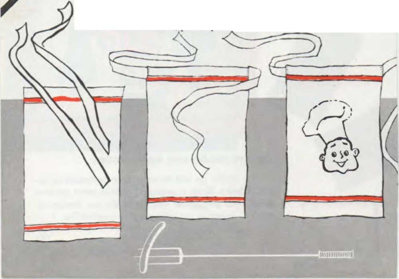 Corta la cinta en dos trozos. Cose cada uno de estos trozos a una punta de la toalla. Fíjate en la ilustración. El delantal ya está listo.