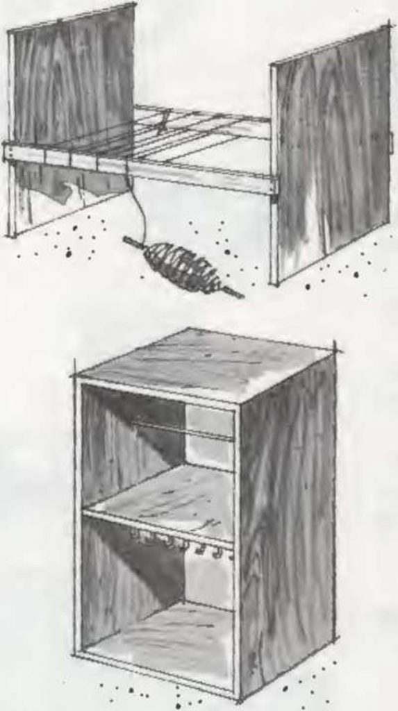 Pon de pie un cajón de embalaje. Clava sendos ganchos en la parte superior de cada uno de los dos lados opuestos del cajón y ata una cuerda a esos ganchos» Esta cuerda será el colgador para la ropa. Clava un estante.