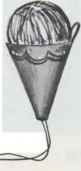 Decora el medio disco de cartón. Enróllalo en forma cónica y une los bordes con cinta adhesiva. Corta la punta del cono para que pueda pasar el hilo. Protege la decoración con una capa de laca. Coloca el ovillo en el interior del cono.