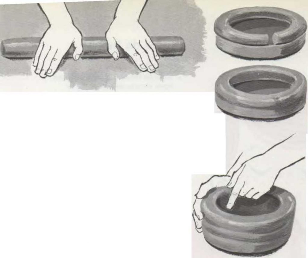 Extiende la tela en el suelo o en una mesa. Aplana una masa de barro. Coloca el plato o el cartón circular encima de la arcilla aplanada. Corta el barro que sobresalga. Antes, mira la ilustración. El círculo de barro que queda será el fondo de la vasija. | ![]() Amasa una larga salchicha o rollo con otra bola de barro. Enróllala alrededor del borde del círculo anterior. Observa la ilustración. Después, alisa las piezas que has unido.