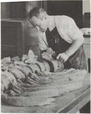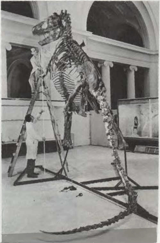 Después, durante semanas enteras, unos trabajadores se afanaron en construir los modelos correspondientes, hechos con arcilla, cartón, yeso, alambre, tubos, piedras e incluso con partes de la auténtica osamenta del dinosaurio.
