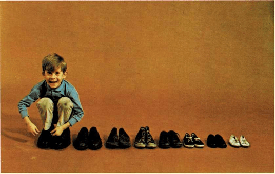 A veces no puedo acabar de gastar mis zapatos porque se me han quedado pequeños. Los zapatitos de cuando era bebé son ahora demasiado pequeños para mí. Pero los zapatos de mi padre son demasiado grandes. A veces me pregunto cómo llegarán a ser mis pies.