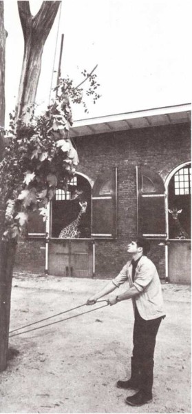 Los guardianes del zoo han de conocer muy bien a los animales para saber cuidarlos. Saben que las jirafas salvajes que viven en Africa estiran su largo cuello hacia los árboles y comen sus hojas. Normalmente así es como comen las jirafas. No pueden bajar la cabeza y comer del suelo, como hacen otros animales. Por esto, los guardianes del zoo tienen un método especial de dar la comida a las jirafas.