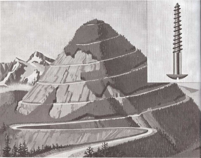 Un tomillo es una máquina. Es un tipo de plano inclinado. El tornillo es como un sendero que sube en espiral hacia la cima de una colina, en lugar de hacerlo en línea recta. Las colinas del dibujo tienen la misma altura, pero el camino que lleva a la cima de la primera colina da más vueltas que el camino de la segunda. El camino que da más vueltas no es tan inclinado como el que da menos vueltas. La pendiente de la primera colina será larga, pero fácil, mientras que la de la segunda será corta, pero más difícil. Cuantas más vueltas dé el camino | alrededor de la colina, tanto más fácil será subirla. Las aristas onduladas de un tomillo tienen la misma función que el camino en espiral que sube por la colina. Los tornillos de la ilustración tienen la misma longitud, pero las aristas del primer tornillo dan más vueltas que las del segundo. Se necesita más tiempo para atornillar el primer tornillo pero es más fácil. El segundo tornillo entra en la madera más rápidamente, pero es más difícil atornillarlo. Por esto, cuanto más juntas estén las aristas del tornillo, tanto más fácil será atornillarlo. |