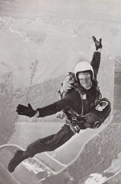El paracaídas es un freno que los paracaidistas llevan en un paquete a la espalda. El paquete está cerrado con pequeñas agujas. Cada aguja va atada a un cable llamado cuerda de rasgadura. Cuando el paracaidista se arroja al vacío, espera un rato y después tira de una manecilla de la cuerda de rasgadura. Esta cuerda hace saltar las agujas y la envoltura del paquete se abre. Un pequeño para-caídas salta y se abre también. El aire choca contra el pequeño paracaídas y éste tira a su vez de un gran paracaídas. El aire choca entonces con el paracaídas grande y lo abre de una sacudida. El paracaidista se balancea en el espacio mientras el aire se va agolpando bajo el paracaídas e impide un rápido descenso. | |