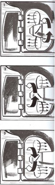 En el dibujo 3, la hélice gira en sentido inverso. Cuando gira hacia atrás, funciona de la misma manera que cuando se cambia la inclinación de las palas. El barco va cada vez más despacio y se detiene.