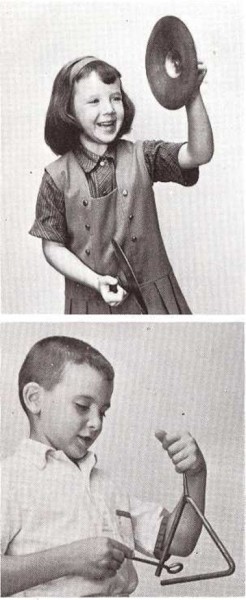 | Si quieres hacer un poco de música, puedes usar muchos tipos de instrumentos; algunos de ellos son fáciles de tocar. Los platillos hacen un ruido infernal cuando los golpeas uno contra otro. El triángulo tintinea cuando lo golpeas con una varilla. |
