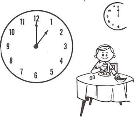 A mediodía ambas agujas señalan el 12. La saeta larga se mueve, pasa al 1, al 2, al 3 y a los demás números, hasta llegar otra vez al 12, mientras que la manecilla corta sólo se ha movido hasta el número siguiente, el 1. Ha pasado una hora desde las doce. |