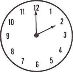 La saeta larga vuelve otra vez a girar, para dar una vuelta, mientras que la manecilla corta sólo se mueve hasta el número siguiente, el 2. Han pasado dos horas desde las doce. Cada vez que la saeta larga da una vuelta completa a la esfera, la manecilla corta avanza sólo hasta el número siguiente. |