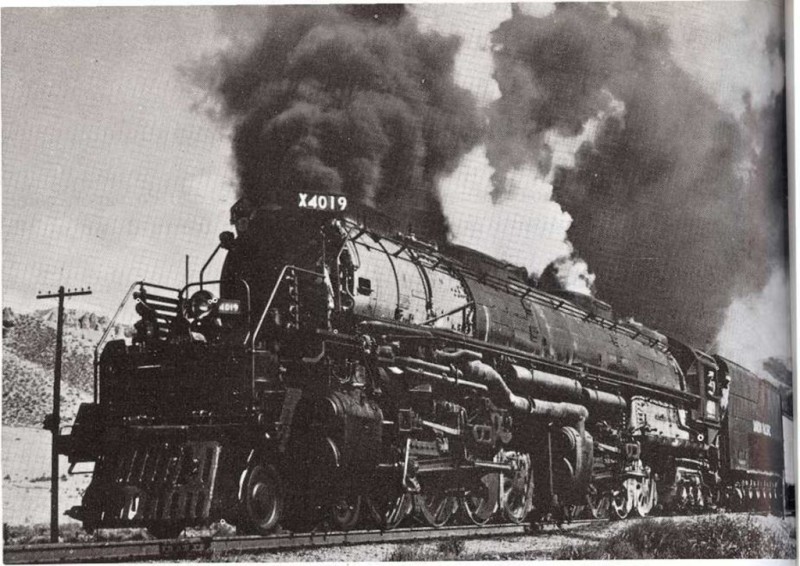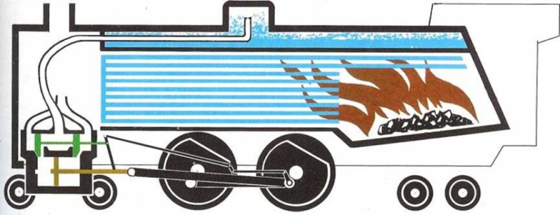 El dibujo de la parte superior muestra el fogón y la caldera de una locomotora. Con el primero y la segunda, el agua se transforma en vapor. La máquina de vapor se ve abajo, a la izquierda.