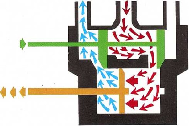 Estos dibujos de la máquina de vapor muestran cómo se mueve el émbolo que se desliza hacia atrás y hacia delante y deja que el vapor presione primero contra un lado del pistón y después contra el otro lado.