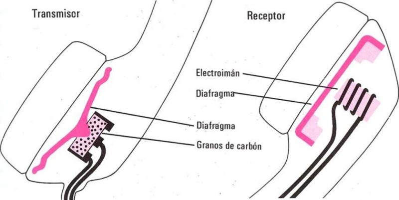 Dentro del transmisor (donde tú hablas) hay una pieza delgada de metal que se llama diafragma. El sonido de tu voz hace vibrar el diafragma. Detrás de este diafragma hay unos granos de carbón, pequeños como los de arena.