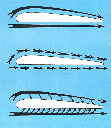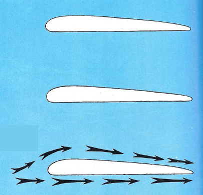 El dibujo muestra que el perfil de la parte superior del ala es más largo que el de la inferior. Cuando un aeroplano está volando, el aire se desliza velozmente sobre la parte superior y bajo la parte inferior. |