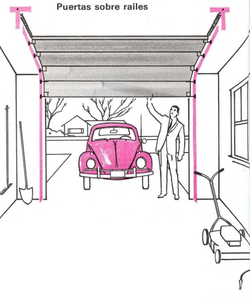 La puerta de un garaje es tan pesada que no podrías levantarla tú solo. Algo debe ayudarte. A veces hay un muelle en la puerta que te ayuda a levantarla. Unas ruedecitas que se deslizan sobre raíles guían la puerta cuando la abres o la cierras.