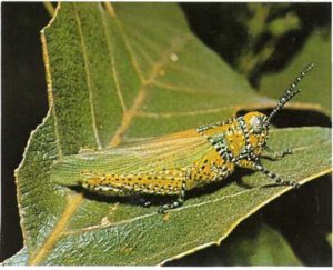 Un joven saltamontes se sube a una rama de árbol. Durante largo rato, el saltamontes está cogido a la ramita sin