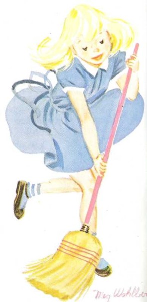da cuatro saltitos: retrocede, avanza; y la escoba sigue con Lola su danza.