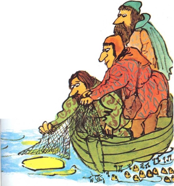 Tres sabios con muy poquito seso creían que la luna era un queso. Un queso que flotaba en el río y quisieron pescarlo, ¡Dios mío! Los peces cantaban a la una contemplando su mala fortuna: ¡No es un queso! ¡Es la luna! ¡ La luna! ¡LA LUNA! |