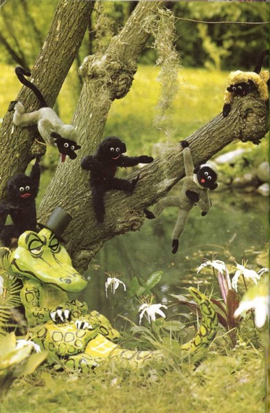 de pronto las monas, de un solo brinco, junto a don Cocodrilo saltan las cinco.