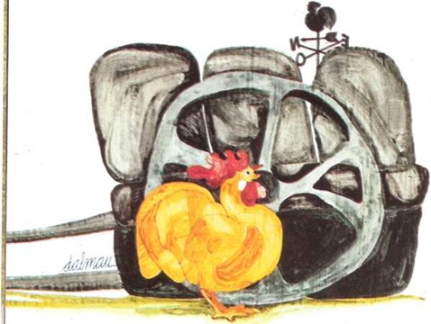 Junto a una carreta coja, un gallo soberbio reta