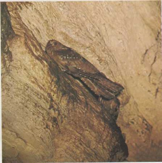 Una caverna puede servir de albergue para murciélagos, ratas, cangrejos y grillos. Pero hay cavernas que constituyen la vivienda de cierta clase de pájaros llamados guácharos. Los guácharos duermen durante el día y buscan comida por la noche. Se parecen un poco a los murciélagos. Como éstos, tienen cierto radar especial. Emiten unos sonidos agudos que, al chocar contra un obstáculo, vuelven otra vez a sus oídos; de este modo, los volátiles saben dónde están colocadas las cosas y vuelan con toda seguridad en la oscuridad de las cavernas. Si quieres ver uno de estos pájaros, puedes ir a la cueva de Guáchar, situada en el estado de Monagas, Venezuela. |
