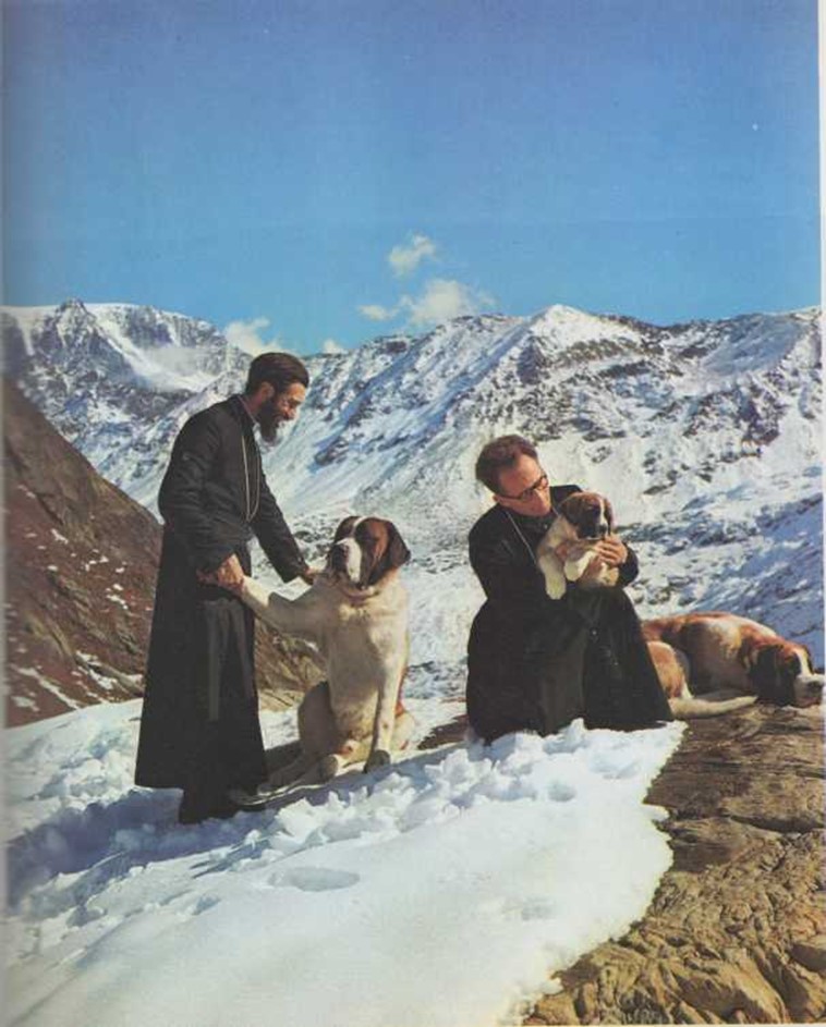 Los monjes adiestran a los perros San Bernardo para el rescate de viajeros extraviados en los Alpes Suizos. |