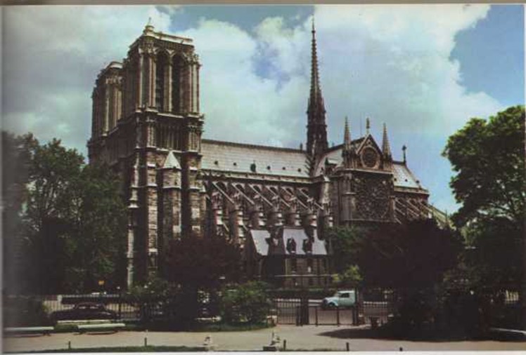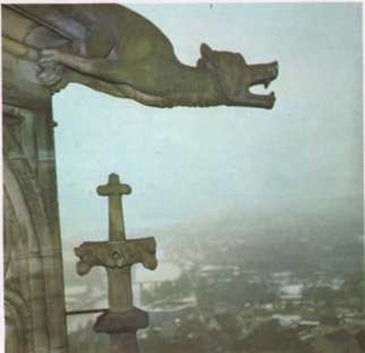 ¿Es esto un monstruo, un león, o un pájaro gigantesco que mira hacia abajo desde lo alto de la iglesia? Es un monstruo mitad hombre y mitad bestia. Pero no es real. Es de piedra y se llama gárgola. Es una de las muchas figuras extrañas que decoran los canalones de la catedral de Notre Dame de París, Francia. Gárgola proviene del latín y significa tragadero o desagüe. Las gárgolas son en realidad tuberías de desagüe. Tienen un canalón por dentro que recoge el agua de lluvia del tejado y la hace salir por la boca de la gárgola. Notre Dame es una antigua catedral edificada sobre una isla del río Sena, en el centro de París. En francés, «Notre Dame» quiere decir Nuestra Señora. Reyes y reinas fueron coronados en esta catedral, entre ellos el emperador Napoleón y la emperatriz Josefina. Desde hace más de seiscientos años, el agua de la lluvia cae del tejado de Notre Dame a través de las gárgolas.
