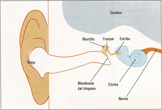 Cuando la membrana de mi tímpano se mueve, golpea tres huesecillos llamados martillo, yunque y estribo. Al golpear estos huesecillos uno contra otro, el estribo entra y sale de un agujero situado en un órgano que se parece a la concha de un caracol. Este órgano es la cóclea. Dentro de la cóclea hay nervios y líquido. Mientras el estribo entra y sale por el agujero de la cóclea forma ondas en el líquido. Las ondas golpean los nervios.