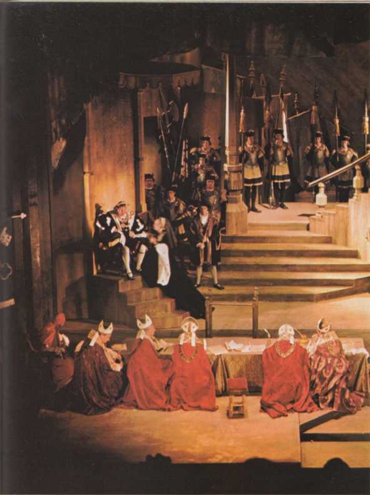 | Actores del teatro Shakespeare Memorial representando la obra Enrique VIII. |