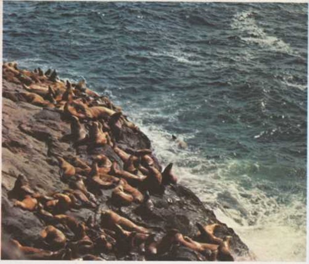 | Leones marinos tomando el sol en la costa rocosa del estado de Oregón, Estados Unidos. |