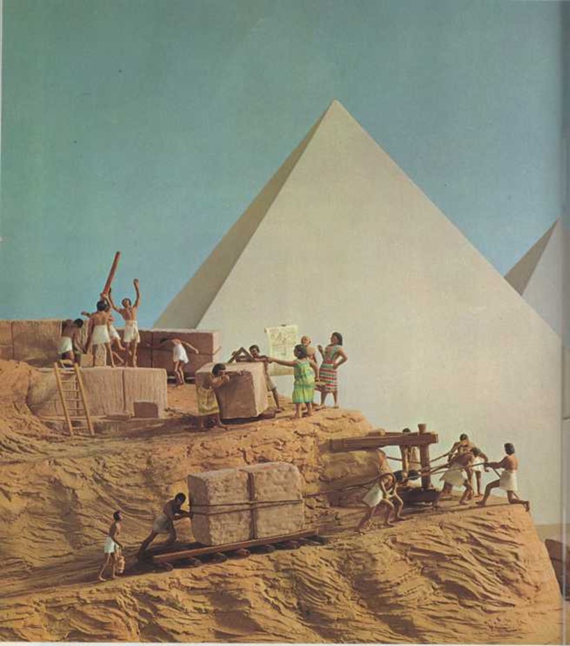 Un rey del Antiguo Egipto, llamado Keops, quería un sitio especial para ser enterrado cuando muriera. Ordenó a sus hombres que edificaran una gran caja de piedra en forma de pirámide, es decir, una construcción similar a una enorme tienda de campaña. La tumba de Keops, que recibió el nombre de Gran Pirámide, resultó realmente gigantesca. Su base es mayor que diez estadios de fútbol, y su cima es tan elevada que haría falta una escalera de ochocientos peldaños para llegar a ella. Pero, ¿cómo fue posible construirla? En aquella época no existían camiones, ni grúas, ni excavadoras que facilitaran el trabajo. Si cada bloque de piedra pesaba más de diez vacas, ¿cómo consiguieron subir estos gigantescos bloques hasta la cumbre de la pirámide? Probablemente los arrastraban por una rampa mediante una especie de trineos, como puedes ver en la ilustración. Pero nadie puede afirmarlo con absoluta certeza, aunque sí se sabe que se precisaron veinte años para construirla. Hoy sería posible edificarla en menos de un año. La Gran Pirámide, construida en Egipto hace más de cinco mil años, es la única entre las maravillas del mundo antiguo que no ha sido destruida; acuden a contemplarla gentes de todo el mundo. |