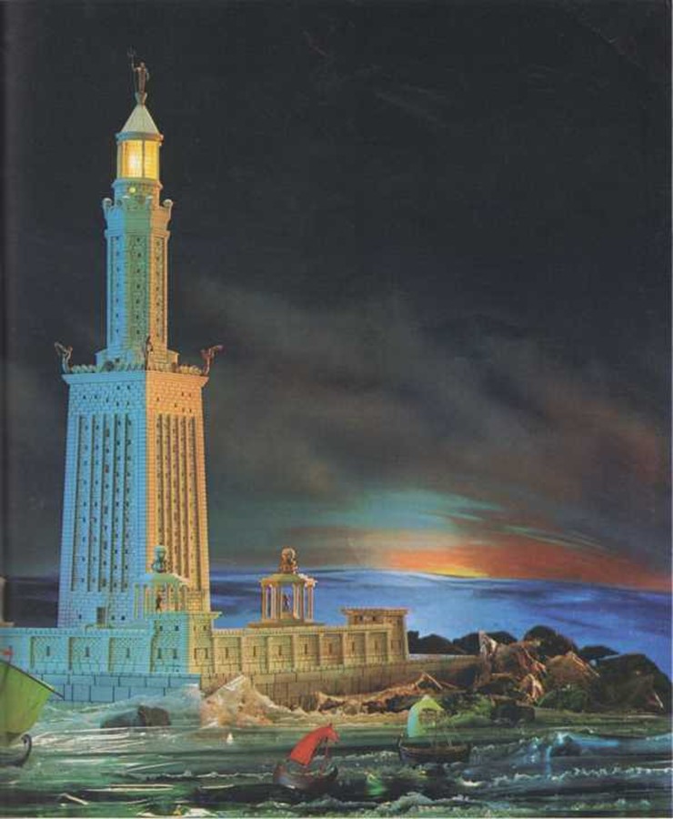 La historia cuenta que un violento terremoto hizo caer el faro al fondo del mar Mediterráneo. El faro de Alejandría no era un faro normal. En su base había una enorme fortaleza de trescientas salas desde la& cuales los soldados se defendían de los barcos enemigos que se acercaban. En la parte superior de la fortaleza había una gran torre’ con un faro de luz tan brillante que los barcos la podían ver a cien kilómetros de distancia.