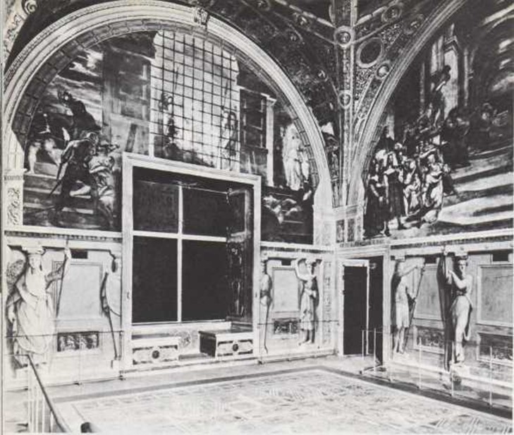 | Frescos de Rafael, famoso pintor italiano, en una de las salas de los palacios del Vaticano, en Roma. |