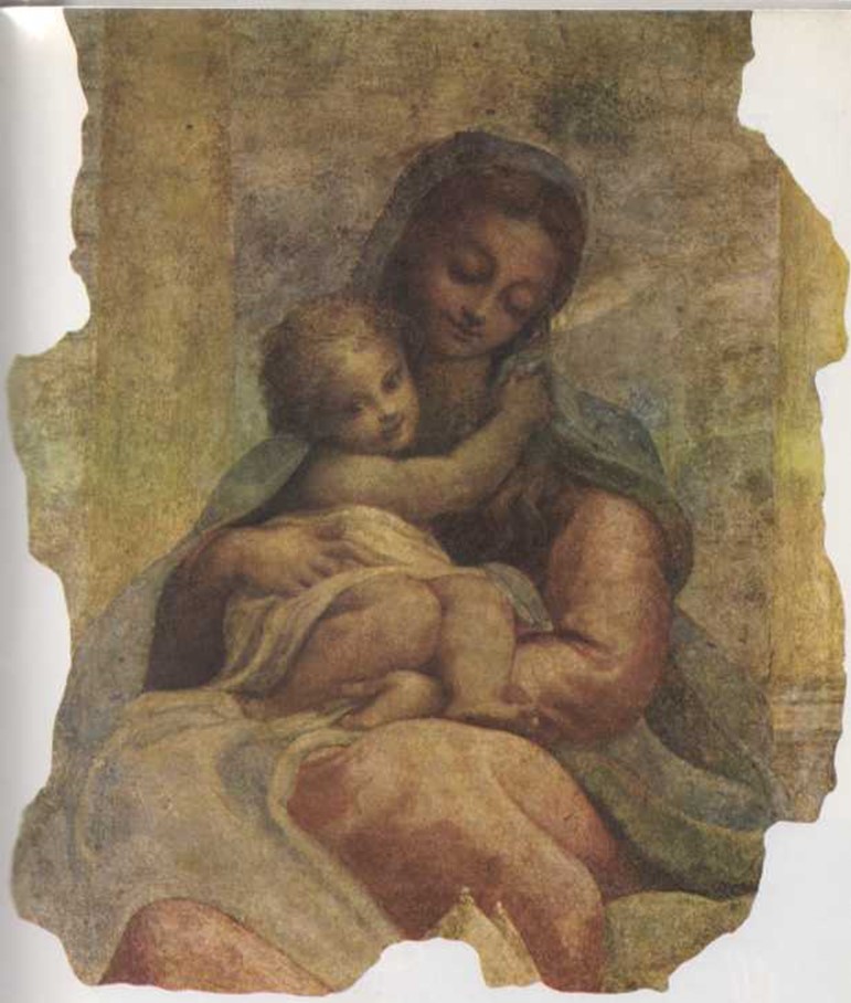 Esta Madona con el Niño se halla en la Pinacoteca de Parma, y es un fresco pintado por el artista llamado Correggio. |