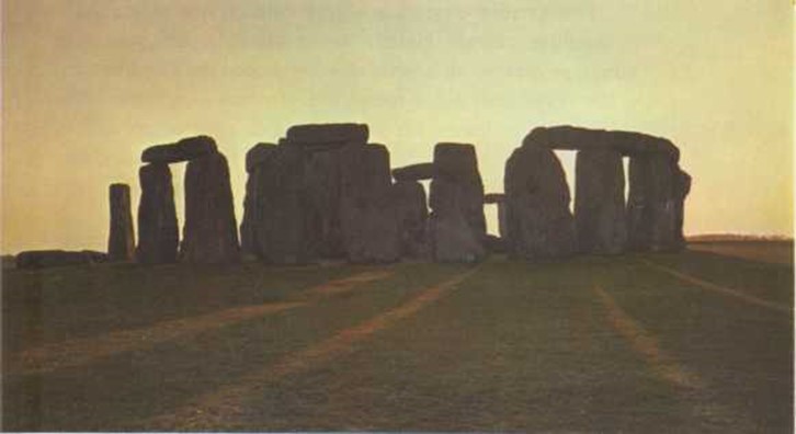 Las enormes piedras de esta ilustración parecen banquetas para dinosaurios o piedras de construcción para gigantes. Pero, ¿quién ha oído decir que en Inglaterra hayan vivido alguna vez dinosaurios o gigantes? Durante muchos años se ha tratado de desvelar el misterio del grupo de piedras llamado Stonehenge. Algunas de esas piedras cayeron en el curso de los siglos, pero parte de Stonehenge ha resistido el paso del tiempo. La gente lo visita porque es una de las pocas construcciones prehistóricas que aún se mantienen en pie. Muchos científicos han estudiado Stonehenge. Unos dicen que los hombres prehistóricos que lo construyeron usaban esas piedras como calendario y como reloj, hace miles de años. Las piedras, dicen, están dispuestas de modo que indican los puntos por donde el sol y la luna salen y desaparecen. Si esta teoría fuera cierta, sería una valiosa prueba de que los hombres prehistóricos eran mucho más ingeniosos de lo que habitualmente se cree. |