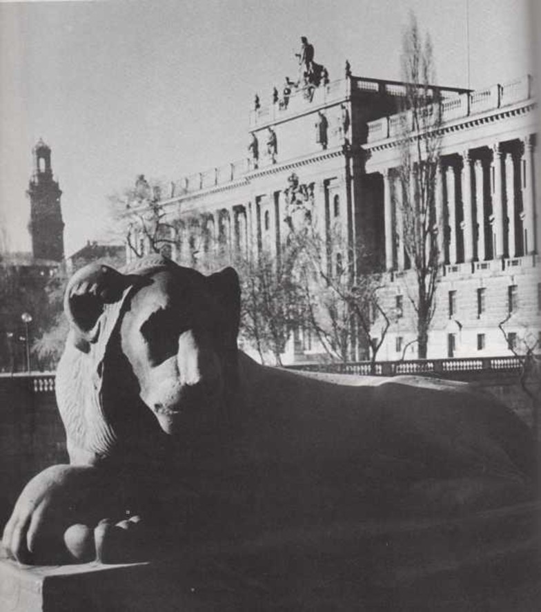 | El edificio situado detrás del león es el Palacio del Parlamento sueco. |