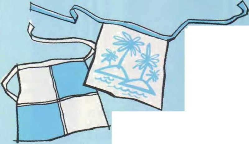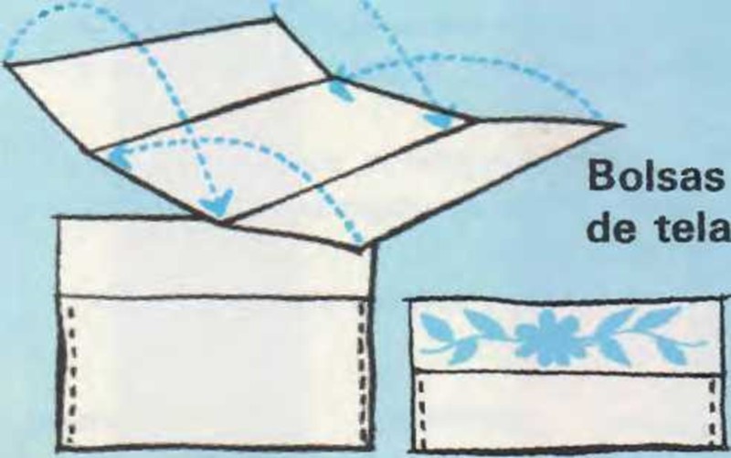 Corta un cuadrado de tela del tamaño de un pañuelo de bolsillo, o de los que se anudan alrededor del cuello o sirven para cubrir la cabeza. Haz un dobladillo en los cuatro lados y cóselo. Mira el dibujo. Pide a tu madre que te ayude a hacer el dobladillo. Los dibujos de esta página te darán alguna idea para decorar el pañuelo. Corta un gran cuadrado de tela. Cose una cinta siguiendo el borde de tres lados del cuadrado. O, simplemente, hazles un dobladillo. Di a tu madre que te enseñe el modo de hacerlo. Cose una cinta ancha para marcar la cintura, y también dos cintas más estrechas para sujetar el delantal. Si tu madre te da cuatro pañuelos, cóselos de modo que formen un cuadrado de tela. Corta un cuadrado de fieltro. Con esto puedes hacer un portamonedas, una bolsa de tocador o un bonito bolso para tu muñeca. Dobla la tela según se te muestra en el dibujo. Cose los lados de la bolsa. Después, tapa ésta con el pliegue superior. |
