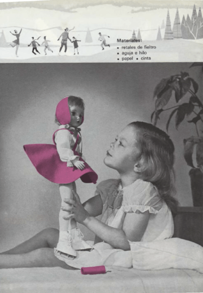 Recorta un círculo de papel como el del dibujo. Procura que tenga las medidas de tu muñeca. Sujeta con alfileres este modelo sobre el fieltro y recórtalo siguiendo el perfil. Para hacer la abertura lateral, corta el trozo de fieltro desde la cintura hasta la mitad. Observa la ilustración. Cose un trozo de cinta a cada lado de la abertura. Estas dos cintas servirán para sujetar la falda a la cintura de la muñeca.