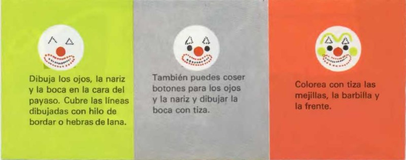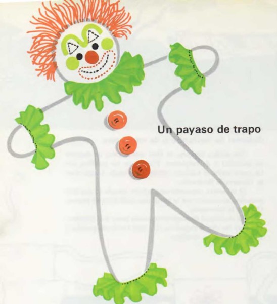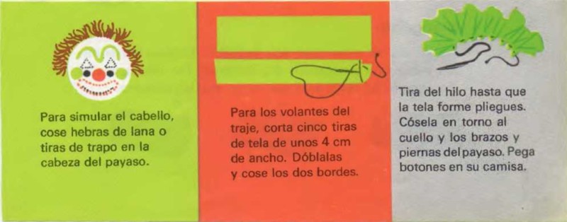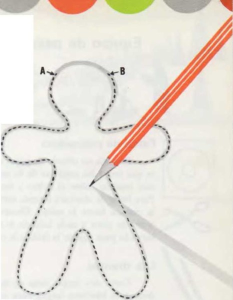 Diseña un modelo del cuerpo del payaso parecido al del dibujo, pero mucho más grande. Recórtalo. Sujétalo con alfileres encima de dos telas superpuestas y corta siguiendo el perfil. Cose las dos telas a partir del punto A. Termina de coser al llegar al punto B. Esta abertura servirá para introducir el relleno. Mira la ilustración. Vuelve el payaso del revés de modo que las costuras queden dentro. Rellénalo de algodón. Para rellenar los brazos y las piernas, presiona el algodón con un lápiz. Ahora, ya puedes coser la abertura de la parte superior de la cabeza del payaso.