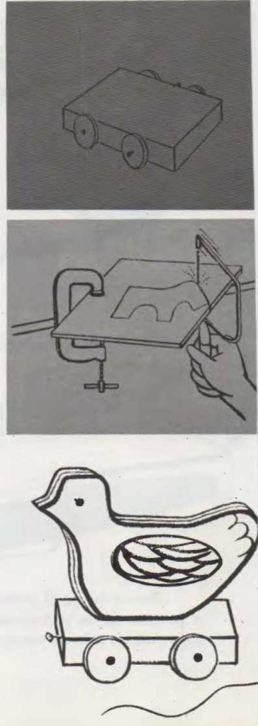 En primer lugar, dibuja el esquema en un papel, o copia el perfil de cualquier animal que aparezca en una revista o un libro, o reproduce una de las figuras de esta página. Recorta el modelo y fíjalo con chinchetas a la chapa de madera. Señala el contorno con un lápiz.
