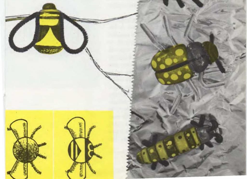 • dos tazas de harina • limpiapipas • cola • una taza de sal • colores de gouache • agua (entre la mitad y un tercio de taza) • un recipiente • papel de seda • laca • dos cucharadas soperas de alumbre en polvo (lo venden en las droguerías) Mezcla la harina, la sal y el alumbre en el recipiente. Cuando la pasta sea espesa y modelable como el barro, ya puedes utilizarla. Coge parte de la pasta, amásala en forma de bola y modélala como el moscardón de la figura. Corta los limpiapipas para hacer las patas y las antenas. Clávalos en los lados del moscardón. Dobla los limpiapipas para dar la forma a las alas. Observa la figura. Pega papel de seda sobre los limpiapipas. Inserta las alas en el cuerpo del insecto. Después de que la pasta se haya secado durante cerca de un día, píntala con colores de gouache. Fija los colores con laca. Del mismo modo, prueba a modelar pájaros, mariposas y arañas.