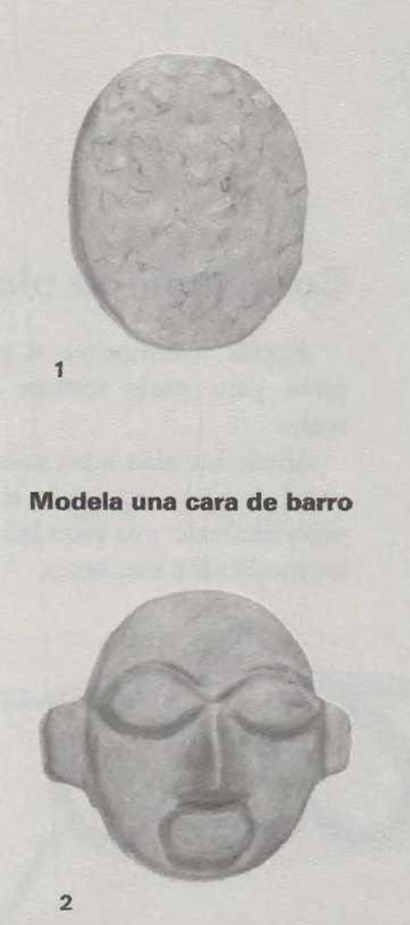 1. Extiende un trozo de hule sobre la mesa. Pon encima la masa de barro. Dale la forma de un óvalo macizo, un poco más grande que tu cara. Mira la ilustración. 2. Con trozos de barro, añade la nariz, la barbilla, las orejas y los labios. Haz unos orificios en el óvalo en los lugares que ocuparán los ojos.
