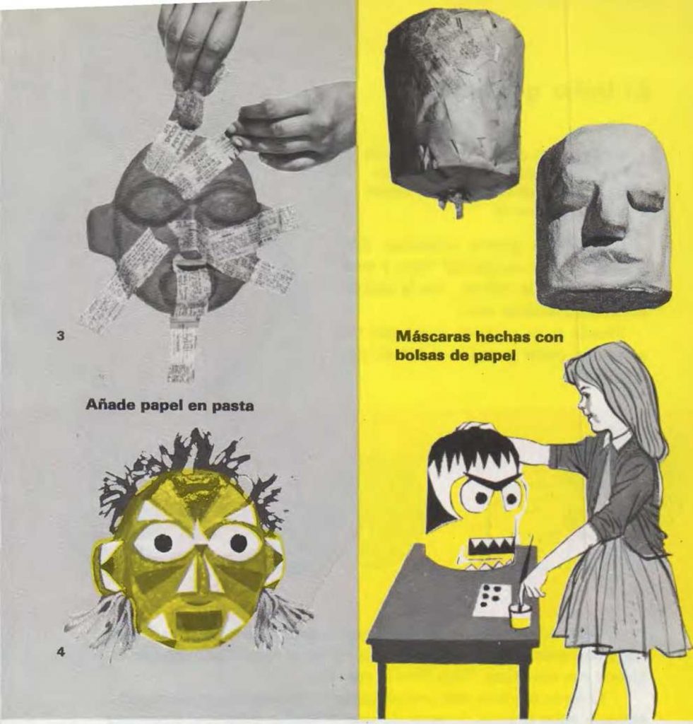 Emplea una bolsa de tamaño mediano o grande. Arruga unos periódicos secos y colócalos dentro de ella. Para que no se salga el material del interior de la bolsa, ciérrala con cinta adhesiva. Ahora, cubre la bolsa con tiras de periódico mojadas y coloca pellas de pasta de papel en los lugares donde estarán la nariz, los labios y los ojos. Recúbrelo todo con más tiras de periódico mojadas. Deja que la máscara se seque. Píntala y corta después el fondo para sacar el relleno. |