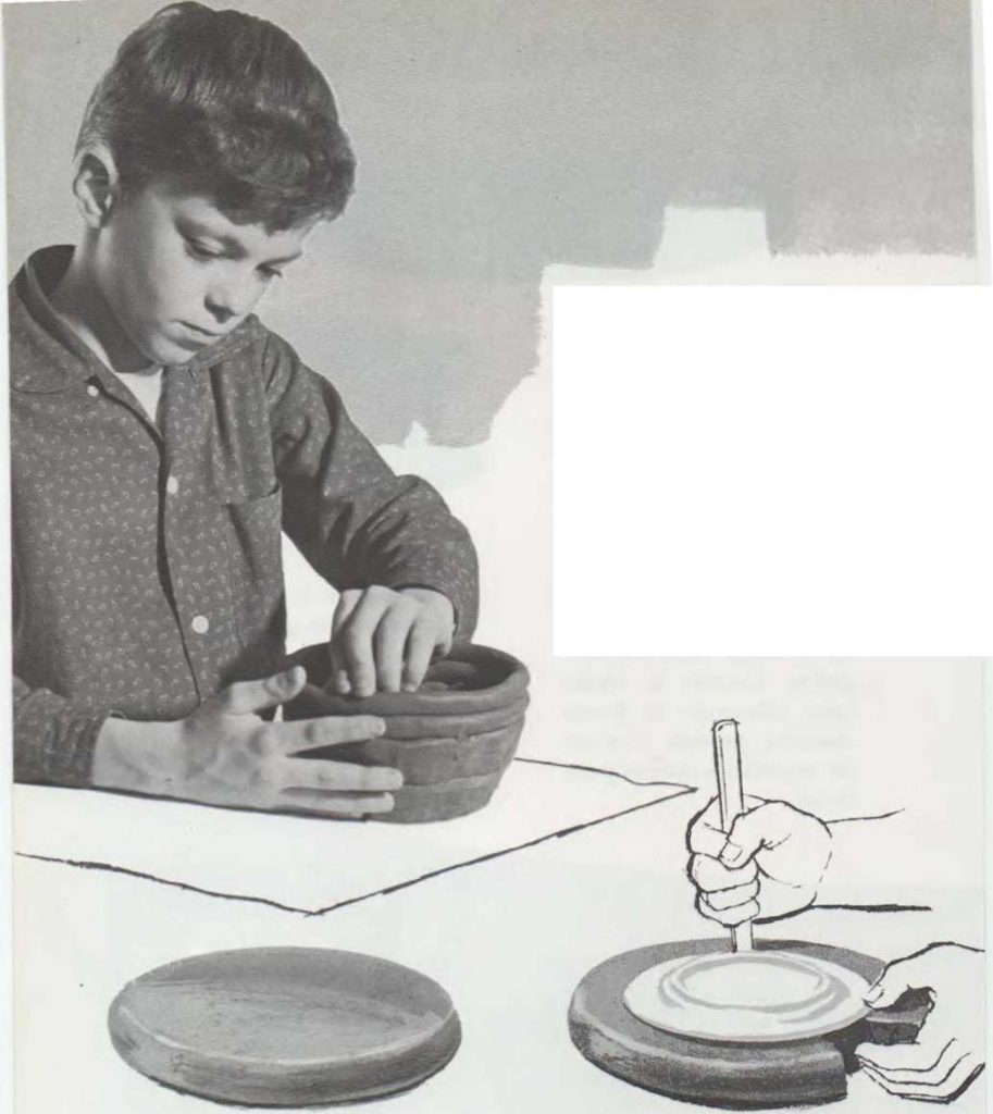 Extiende la tela en el suelo o en una mesa. Aplana una masa de barro. Coloca el plato o el cartón circular encima de la arcilla aplanada. Corta el barro que sobresalga. Antes, mira la ilustración. El círculo de barro que queda será el fondo de la vasija. |