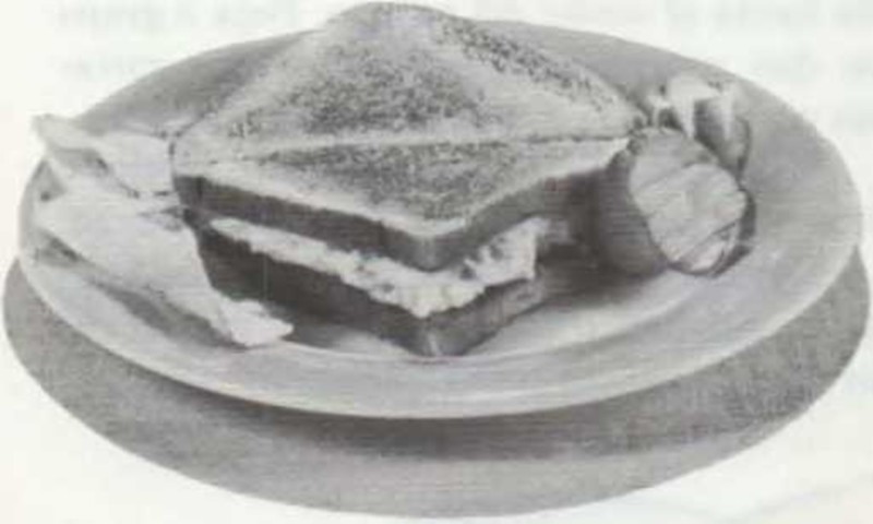 Bocadillos suculentos Ingredientes para dos: • 1/4 de taza de atún en lata o jamón en dulce • un huevo duro (en la página 238 hallarás el modo de hacerlo) • una cucharada de mayonesa • sal Con un tenedor desmenuza el atún, o corta el jamón a trocitos con un cuchillo. Corta también el huevo en trozos pequeños. Junta la carne y el huevo en una fuente. Añade mayonesa y sal. Mézclalo todo bien. Extiende la mezcla sobre una rebanada de pan o una tostada. Pon otra rebanada encima y sírvelo con rodajas de pepino. |