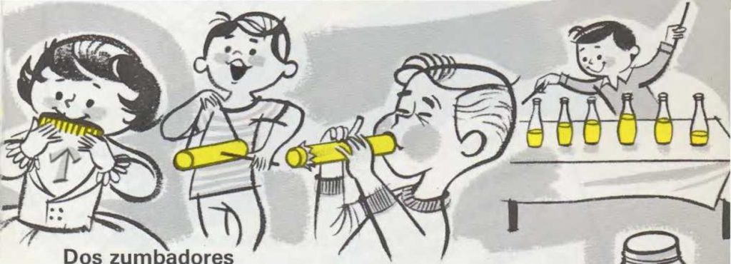 Recorta un círculo de papel parafinado más grande que la circunferencia del tubo y colócalo tirante en uno de sus extremos. Sujétalo en su sitio con una goma elástica. Canta O-O-O-O en el extremo descubierto del tubo. Un peine envuelto con un papel de seda, es otro tipo de zumbador. Cuando soples notarás un ligero cosquilleo en tus labios, producido por la vibración del papel de seda. |