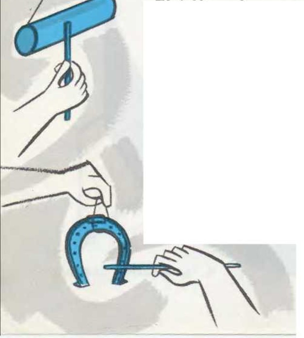 El triángulo se sostiene por una cuerda, igual que un gong. Utiliza un pedazo de cuerda tres veces más largo que la tubería. Pasa la cuerda por el interior y anuda entre sí los dos extremos. Si empleas una. herradura en vez de una tubería para hacer el triángulo, basta con atar un extremo de la cuerda a la mitad de la herradura.